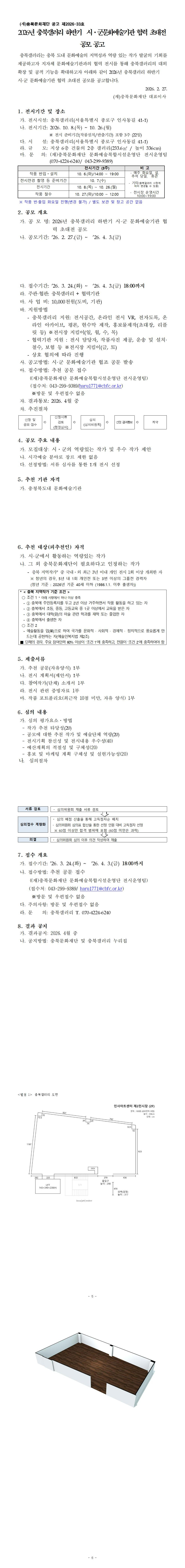'공지사항' 컨텐츠 2026년 충북갤러리 하반기 시·군문화예술기관 협력 초대전 공모 공고 상세 내용 2026년 충북갤러리 하반기 시·군문화예술기관 협력 초대전 공모 공고 Feb 27, 2026 상세보기 접수방법: 추천 공문 접수 ((재)충북문화재단 문화예술복합시설운영단 전시운영팀) hwp 문서 (신청서양식)2026년 충북갤러리 하반기 시·군 문화예술기관 협력 초대전.hwp jpg 문서 2026년 충북갤러리 하반기 시군 문화예술기관 협력 초대전 공고문.jpg NEXT LIST